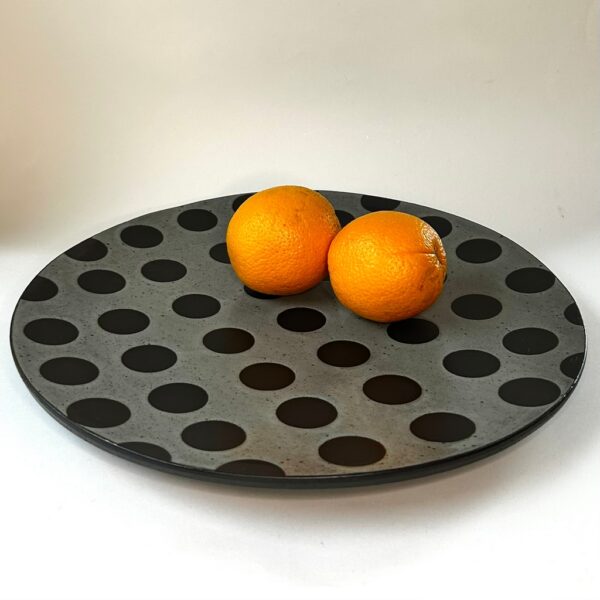 Mustast kõrgkuumussavist suur vaagen, mille hallikat pinda täiustab tumedate mummude mäng.